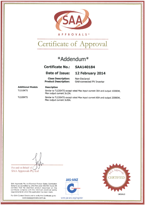 特雷斯”成功獲取了澳大利亞SAA產品認證,三相并網逆變器順利通過了IEC 62109-1 Ed 1.0和IEC 62109-2 Ed 1.0光伏并網逆變器新標準。