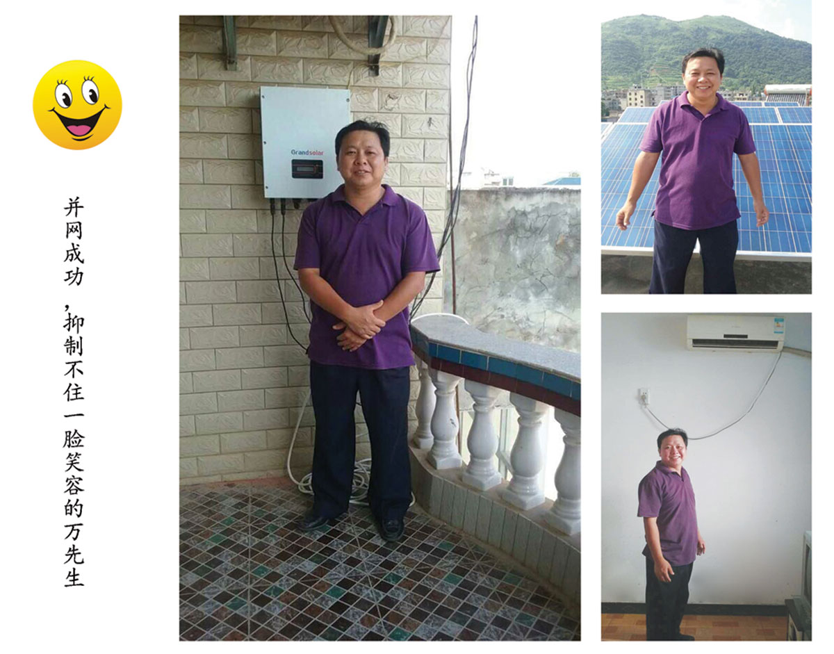 “我的小發(fā)電廠正式發(fā)電啦!不僅完全可以滿足自家用,用不完的還可以賣給電網(wǎng)”。2015年8月16日,看到建在自家屋頂220伏光伏發(fā)電項目成功并網(wǎng),陽新縣萬師傅一臉抑制不住的興奮。萬師傅220伏光伏并網(wǎng)項目裝機容量為3KW,采用自發(fā)自用、余電上網(wǎng)的方式,如果光照充足,設(shè)備性能好,3-5年即可回本。